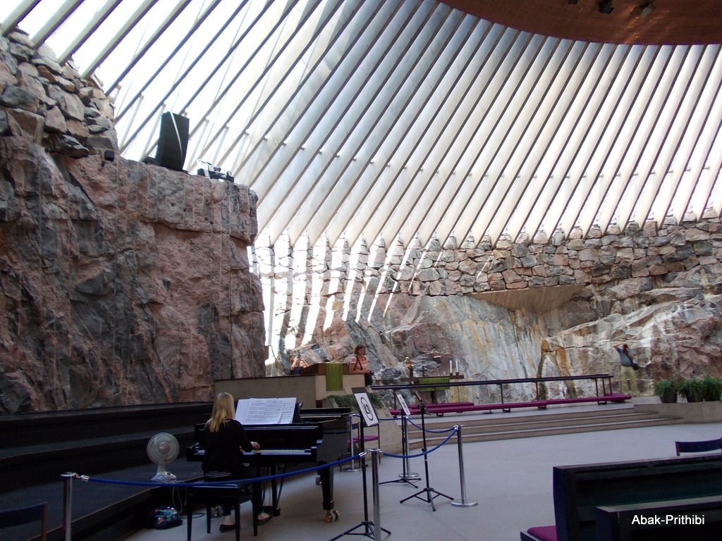 চলে আসি রক চার্চ(Temppeliaukio Church), ভেতরে সুরেলা সুরে এক মেয়ে পিয়ানো বাজিয়ে চলেছে। পরিবেশটাকে এক অদ্ভুত শান্ত করেছে এই সুর। মিষ্টি এক সুরে ছেয়ে যাচ্ছে মস্তিষ্ক। কোন তাড়া নেই, সেই সুর যেন সম্মোহিত করে ফেলেছে।